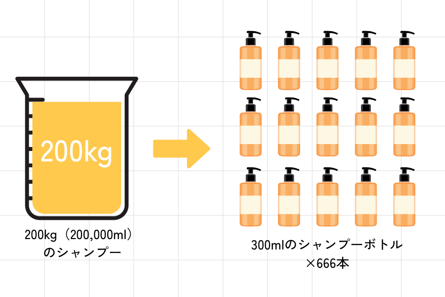 仮に300mlで販売価格2,000円のシャンプーを作ろうと企画した場合、ロットを200kgと仮定すると、